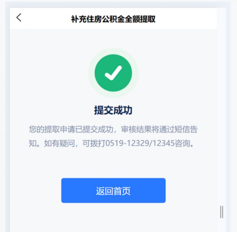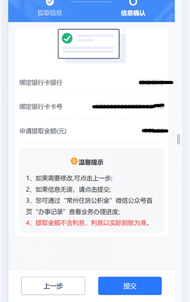 (3)仔细确认提取信息,如信息有误,选择“上一步”,信息确认无误的,选择:提交',显示“提交成功”,就完成补充住房公积金提取业务。