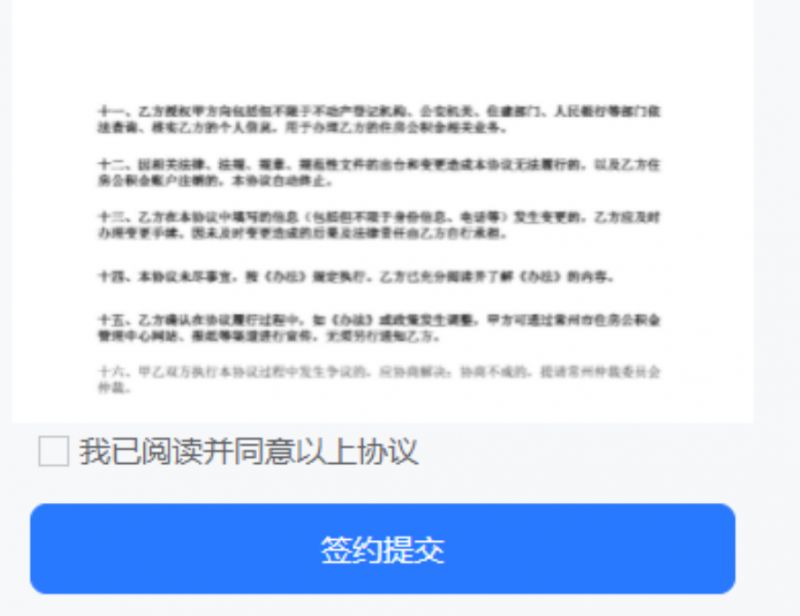 (2)首先点击"补充住房公积金签约”,仔细阅读常州市补充住房公积金缴存使用协议"后,勾选“我已阅读并同意以上协议”,点击*签约提交",则签约完成。
