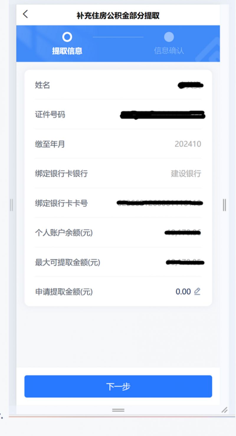 (2)以‘补充住房公积金部分提取”为例,点击"补充住房公积金部分提取”,输入“申请提取金额”,点击“下一步”。