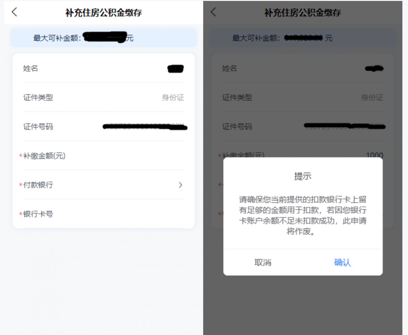 (1)点击"补充住房公积金缴存",输入补缴金额、选择付款银行、输入银行卡号,点击"保存并提交"后,仔细阅读跳出的“提示”,没有问题后点击“确认”。
