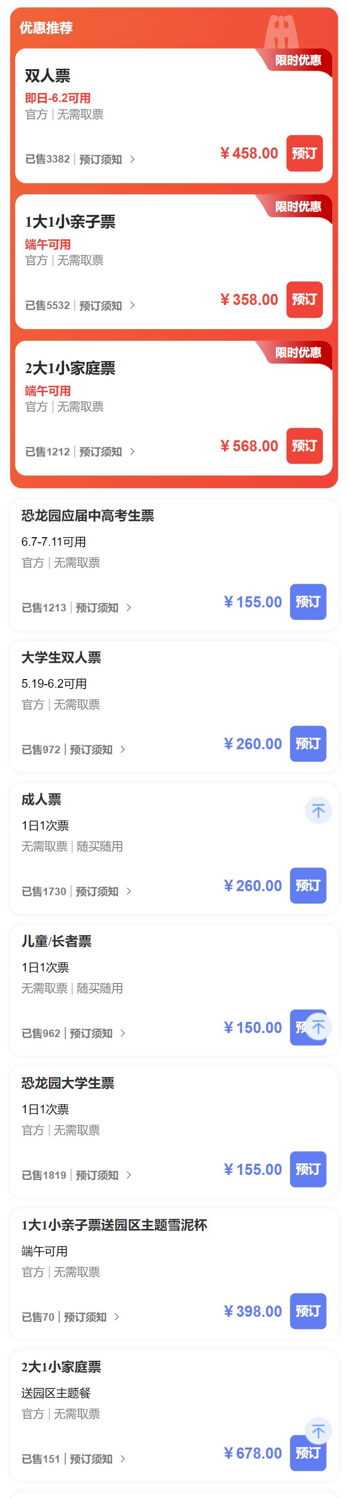 1. "成人票":通常情况下,成人票价约为150-200元人民币,具体价格以官方公布为准。 2. "儿童票":身高1.2米(不含)以下的儿童可免费入园,1.2米(含)至1.5米(不含)的儿童购买儿童票,价格约为70-100元人民币。 3. "老年人票":60岁以上(含)的老年人凭有效证件购买优惠票,价格约为100-150元人民币。