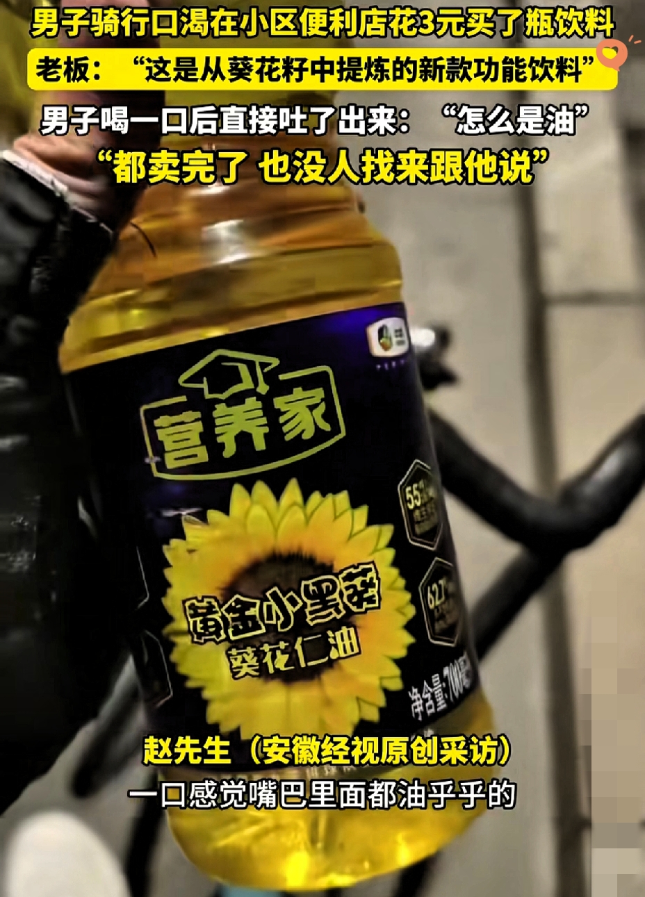 江苏常州一男子骑行口渴,在小区便利店买了瓶“葵花籽提炼的新款功能饮料”,结果入口直接吐了——