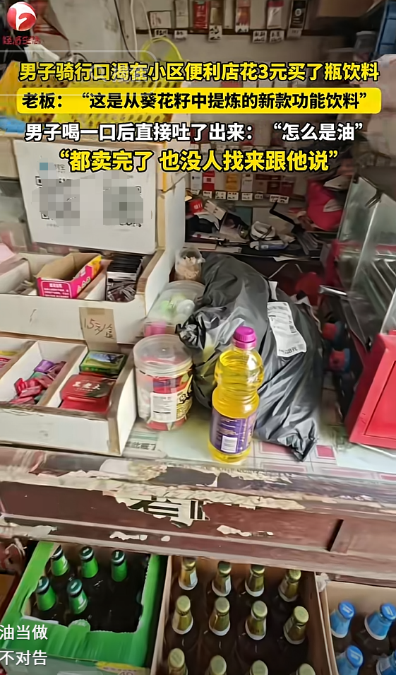 (来源:AHTV第一时间 2025年10月7日 江苏常州,小区便利店老板误将食用油当做新款功能饮料买给居民,当男子发现不对劲告诉他时,别人送他的油一家基本卖完)
